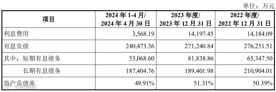 2022年度、2023年度和2024年1-4月,上市公司备考合并利息费用分别为14,184.09万元、14,197.45万元和3,568.19万元;2022年末、2023年末和2024年4月末,上市公司备考合并有息债务分别为276,251.51万元、271,240.84万元和 240,473.36万元,其中短期有息债务为65,347.50万元、81,838.86万元和53,068.60万元,以长期有息债务为主。