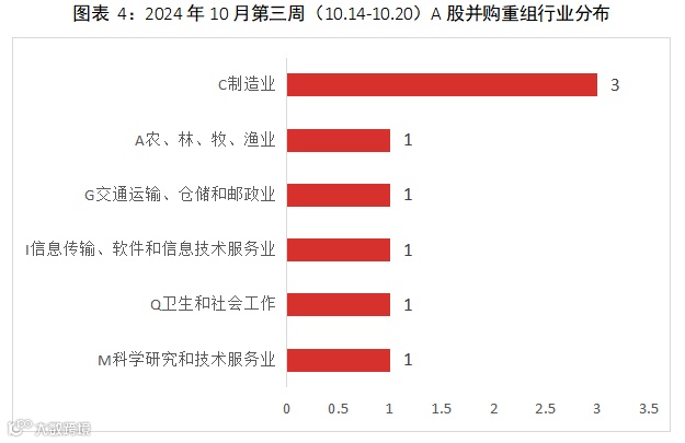 按证监会一级行业统计,2024年10月第三周(10.14-10.20)A股并购交易的8家上市公司分布在6个一级子行业。其中C制造业以3家上市公司的数量位居榜首,其余行业均为1家上市公司。这反映了制造业作为经济发展的重要支柱,在当前经济环境下仍然具有强大的生命力和发展潜力。而传统制造业面临着转型升级的压力,通过并购重组,企业可以快速获得新技术、新市场和新资源,从而提升竞争力,制造业在并购重组市场的活跃表明制造业企业正积极利用资本市场的工具来实现自身的发展战略和目标。
