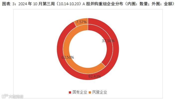 按照上市公司实际控制人分类统计,2024年10月第三周(10.14-10.20)A股并购重组的8家上市公司中,国有企业和民营企业分别有3家和5家,占比分别为37.50%和62.50%;从交易金额来看,分别为539,261.32万元和44,181.97万元,占比分别为92.43%和7.57%。