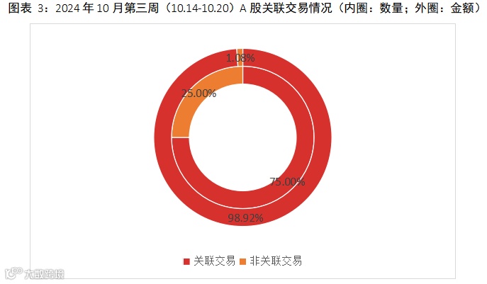 从关联交易情况看,2024年10月第三周(10.14-10.20)A股并购重组的8家上市公司中,有6家构成关联交易,占比为75%,有2家不构成关联交易,占比为25%;从交易金额来看,关联交易金额为577,161.32万元,占比为98.92%,非关联交易金额为6,281.97万元,占比为1.08%。