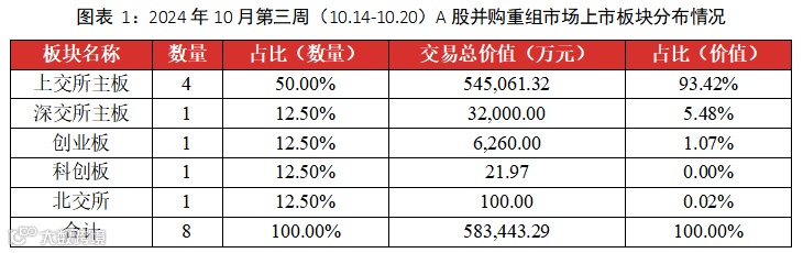 据统计,2024年10月第三周(10.14-10.20),A股上市公司共发生8笔并购重组交易。从上市板块来看,上交所主板发生4笔、科创板发生1笔;深交所主板发生1笔、创业板1笔;北交所发生1笔。