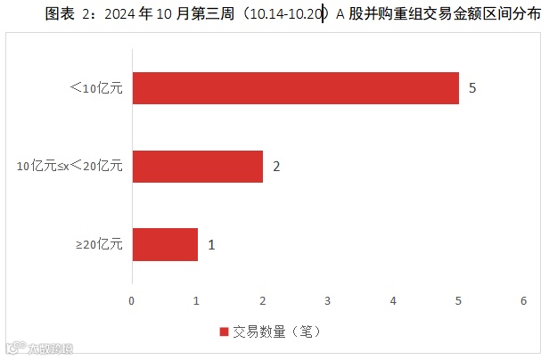 从交易金额区间来看,2024年10月第三周(10.14-10.20)A股并购重组交易中,交易金额低于10亿元的共有5笔,数量排名第一;其次是10亿元到20亿元之间(包括10亿元),共有2笔,排名第二;大于20亿元(包括10亿元)的共有1笔,排名第三。