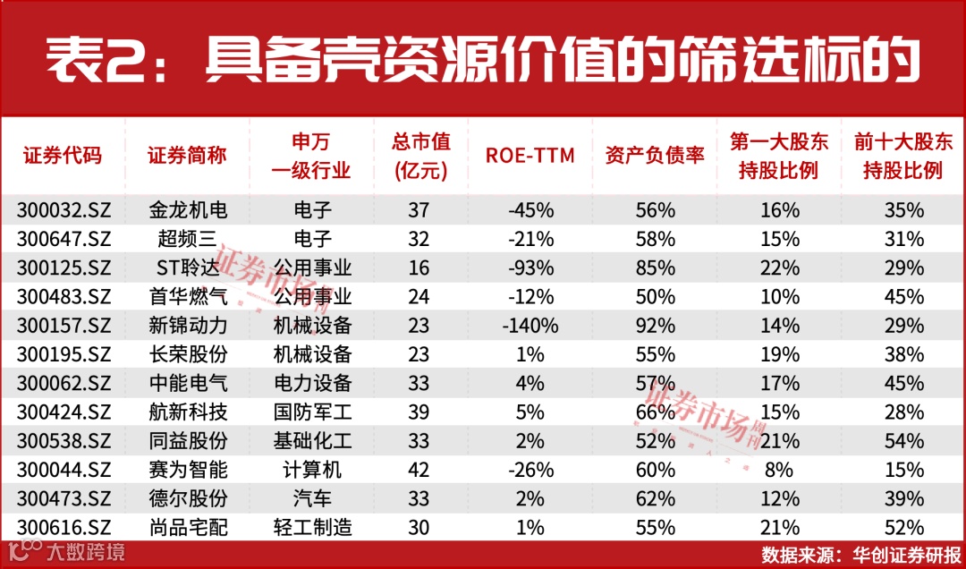 具备壳资源价值的筛选条件是,1.成本考量,总市值<50亿元;2.持股比例分散;3.盈利性不足;4.负债率较高;5.民营企业。据此筛选,有金龙机电、超频三和ST聆达等12家公司符合标准(见表2)。