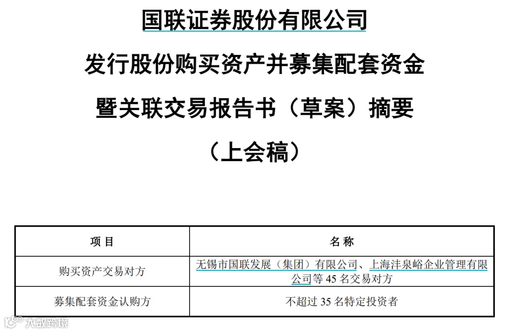 8月8日晚间,国联证券公布重组草案,拟通过发行A股股份方式向国联集团等45名交易对方购买民生证券99.26%股份,交易作价294.92亿元。