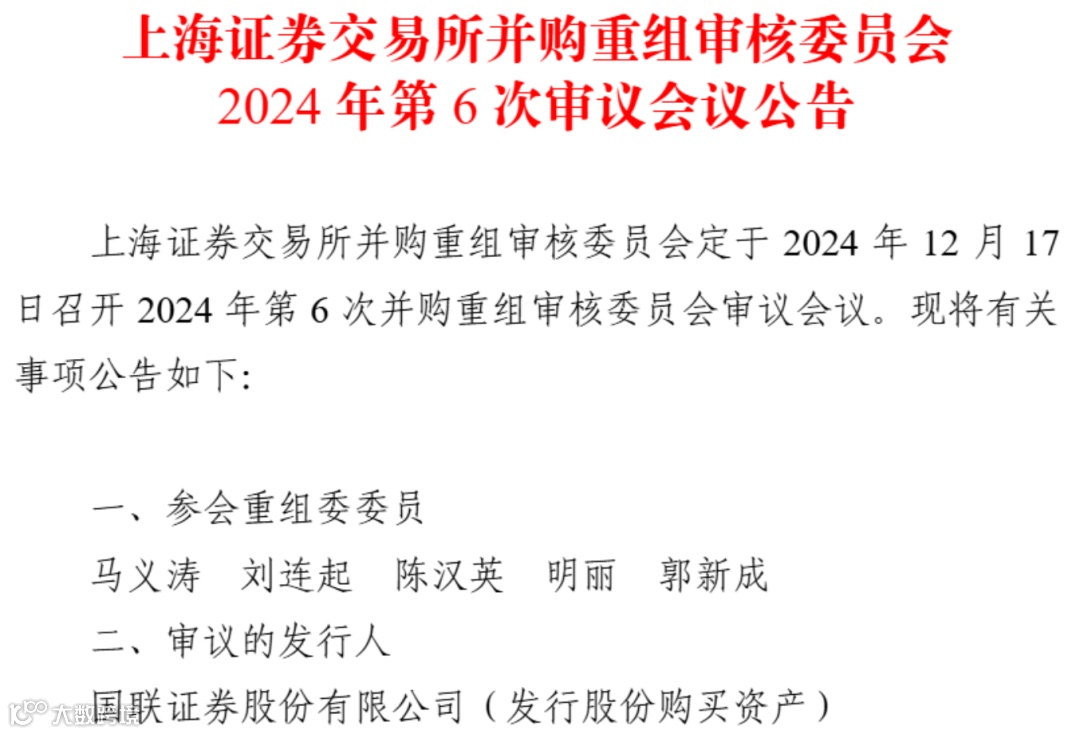 12月10日晚间,国联证券公告称,上交所并购重组审核委员会定于2024年12月17日召开2024年第6次并购重组审核委员会审议会议,审核公司本次交易的申请。