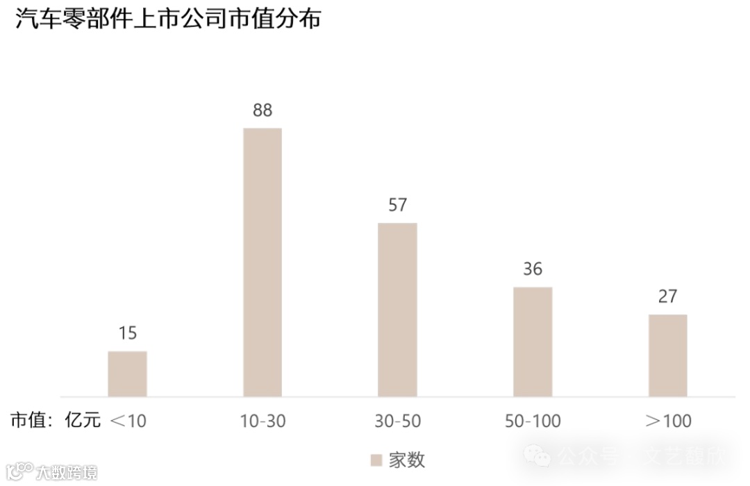 从市值分布来看,因汽车产业的蓬勃发展,汽零企业的估值也在2020年起经历了系统性提升,但目前A股汽零市值仍主要集中于50亿元以下,整体还呈现着小而分散的竞争格局。