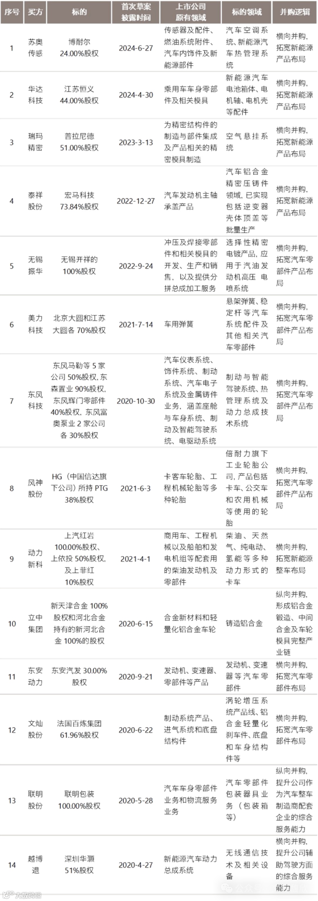 随着汽车零部件行业的不断发展,产业链整合与优化成为行业发展的重要趋势。这种产业链整合与优化的趋势,将进一步提高汽车零部件行业的整体效率和竞争力,自2020年初以来,A股汽车零部件企业并购情况具体如下: