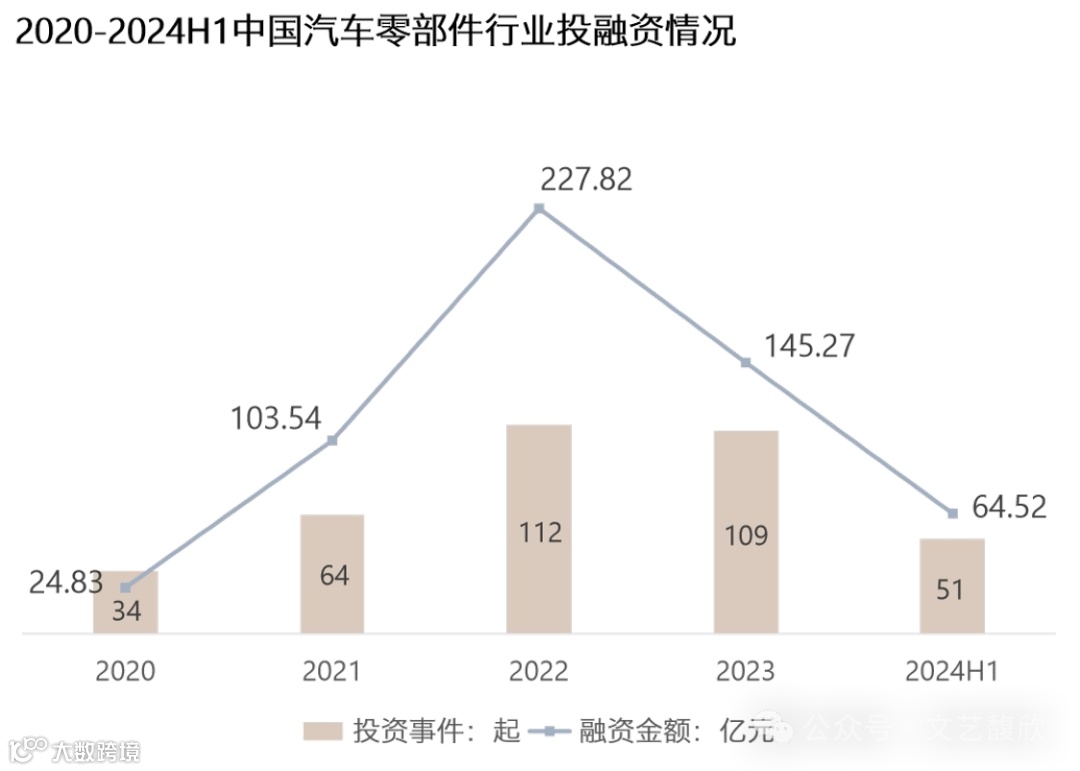 自2023年下半年起,IPO节奏显著收紧,2024年至今,根据Wind行业分类,仅2家汽车零部件企业顺利上市。目前,共62家汽车零部件企业仍在问询阶段或已宣告终止,主要分布在结构件、汽车电子、热管理系统等细分领域。此外,一级市场的投融资遇冷进一步加剧了汽零企业的资金压力。根据中商情报网数据,一级市场的投融资次数及融资金额均自2020年起不断攀升,于2022年达到峰值,但2023年,融资金额便接近腰斩。