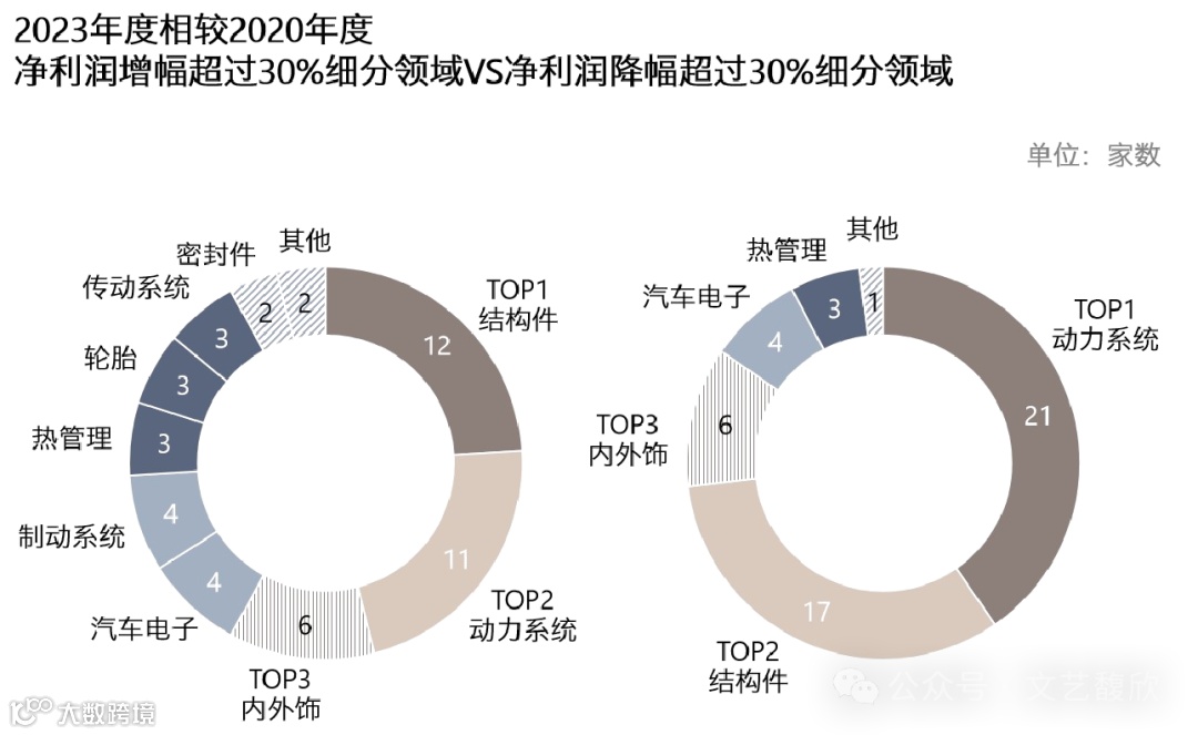 从净利润角度,以2020年初已完成上市,完整经历新能源汽车爆发式增长的137企业为例,2023年净利润相较2020年净利润增幅和降幅超过30%分别有50家和52家,划开一道明显的分水岭,且细分领域均主要包括结构件、动力系统及汽车内外饰等,可谓在同一细分领域下“旱涝不均”。