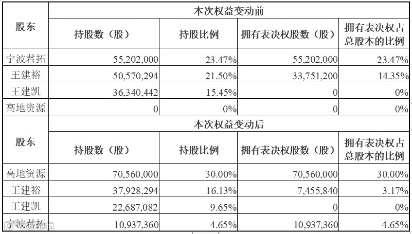 本次权益变动前后,王建裕、王建凯先生与宁波君拓、高地资源的持股情况 具体如下: