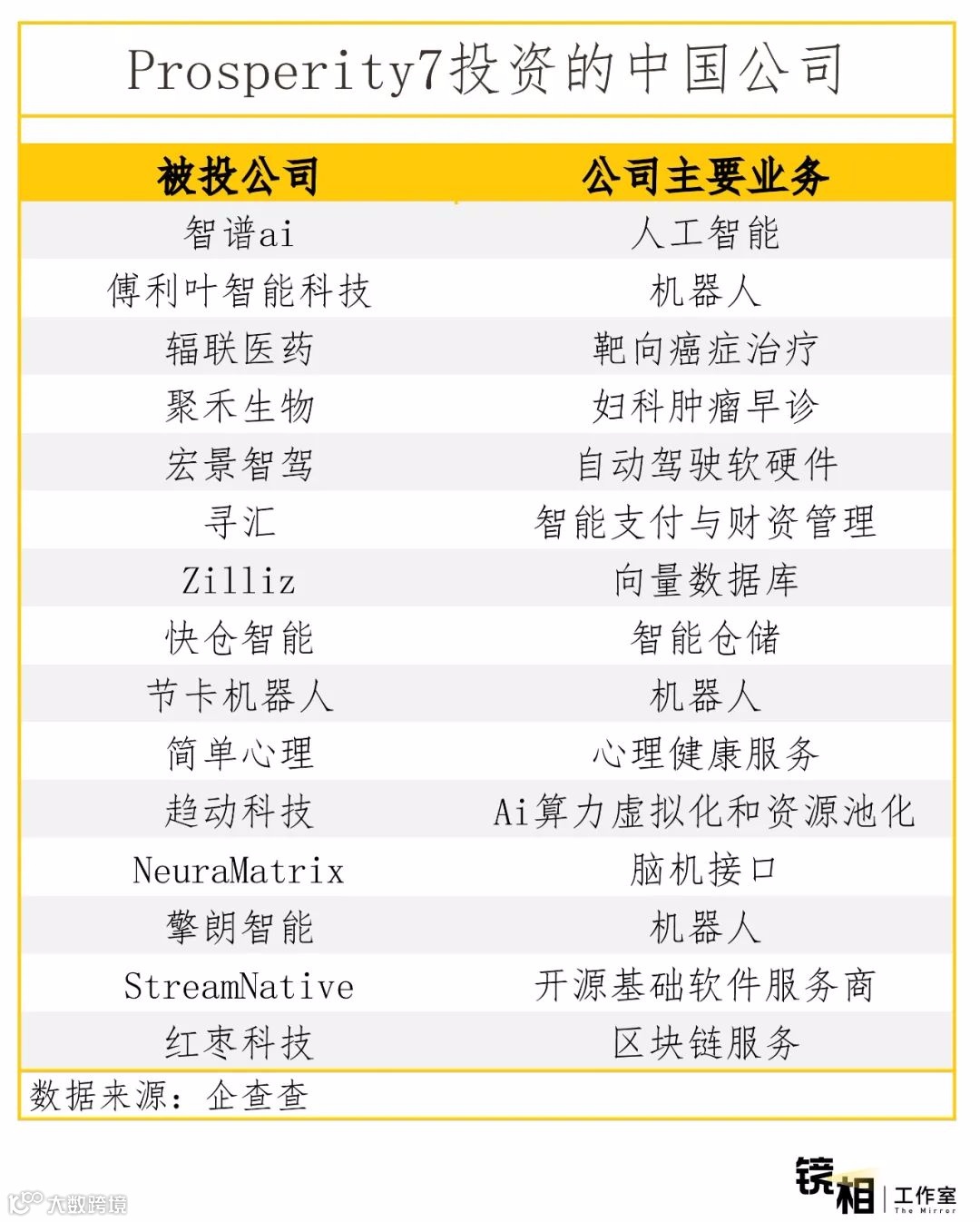 据企查查数据,从2020年至今,Prosperity7已投资了包括聚禾生物、宏景智驾、傅利叶智能科技在内的15家中国公司,涉及领域包括医疗健康、人工智能、新能源汽车、金融支付等。