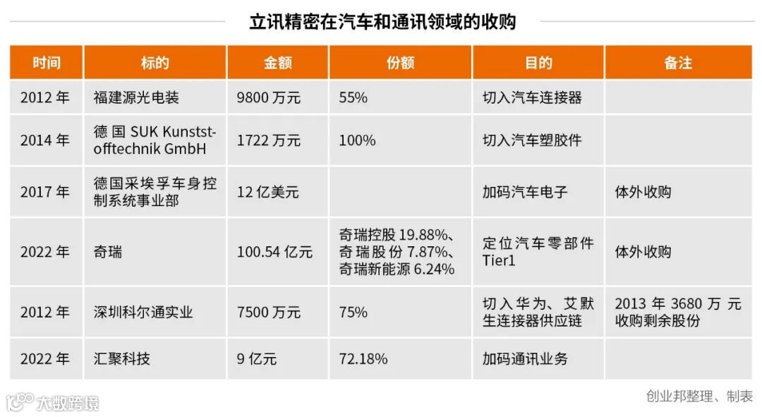 或许是不能再给上市公司增加负担,近几年的大额收购多是通过立讯有限及其关联公司进行。比如3.6亿美元收购光宝相机模组事业部、22亿港元收购高伟电子、100亿元投资奇瑞等。