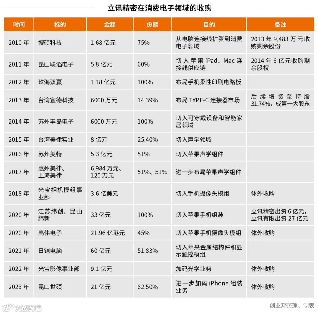 尝到收购甜头的立讯精密迅速加快了并购脚步。从零部件、模组供货到整机组装,步步为营,逐渐向苹果供应链渗透。