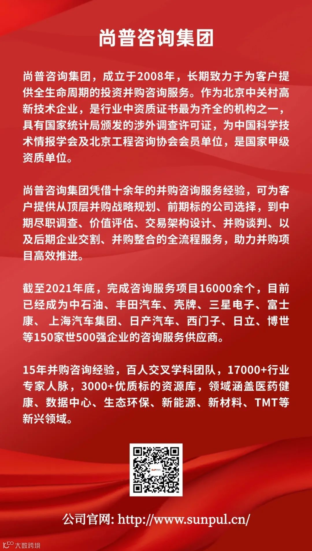尚普咨询集团,成立于2008年,长期致力于为客户提供全生命周期的投资并购咨询服务,如并购咨询、并购战略规划、尽职调查、交易架构设计、可行性论证等服务。