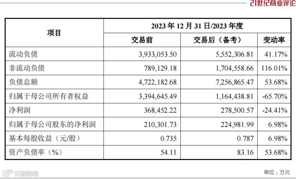 截至2023年末,其资产负债率为54.11%,交易完成后,猛升至83.16%。