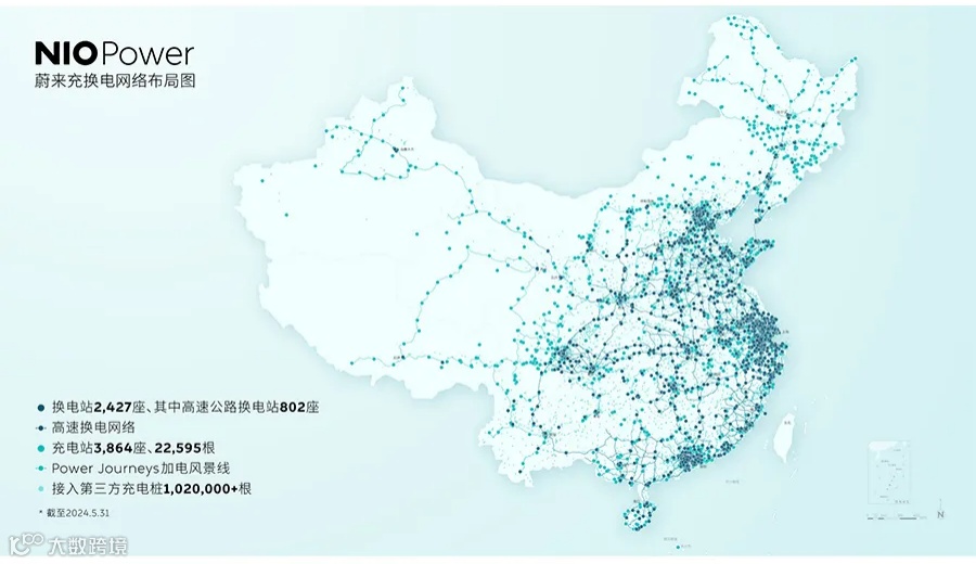 眼下,换电已成为新能源汽车主流补能模式。而蔚来官网中一则视频显示,通过蔚来换电站,即可实现全自动换电,3分钟满电出发。截至2024年5月31日,蔚来已在全国建设换电站2427座、充电桩22595根,是全国布局换电站、充电桩最多的汽车品牌。