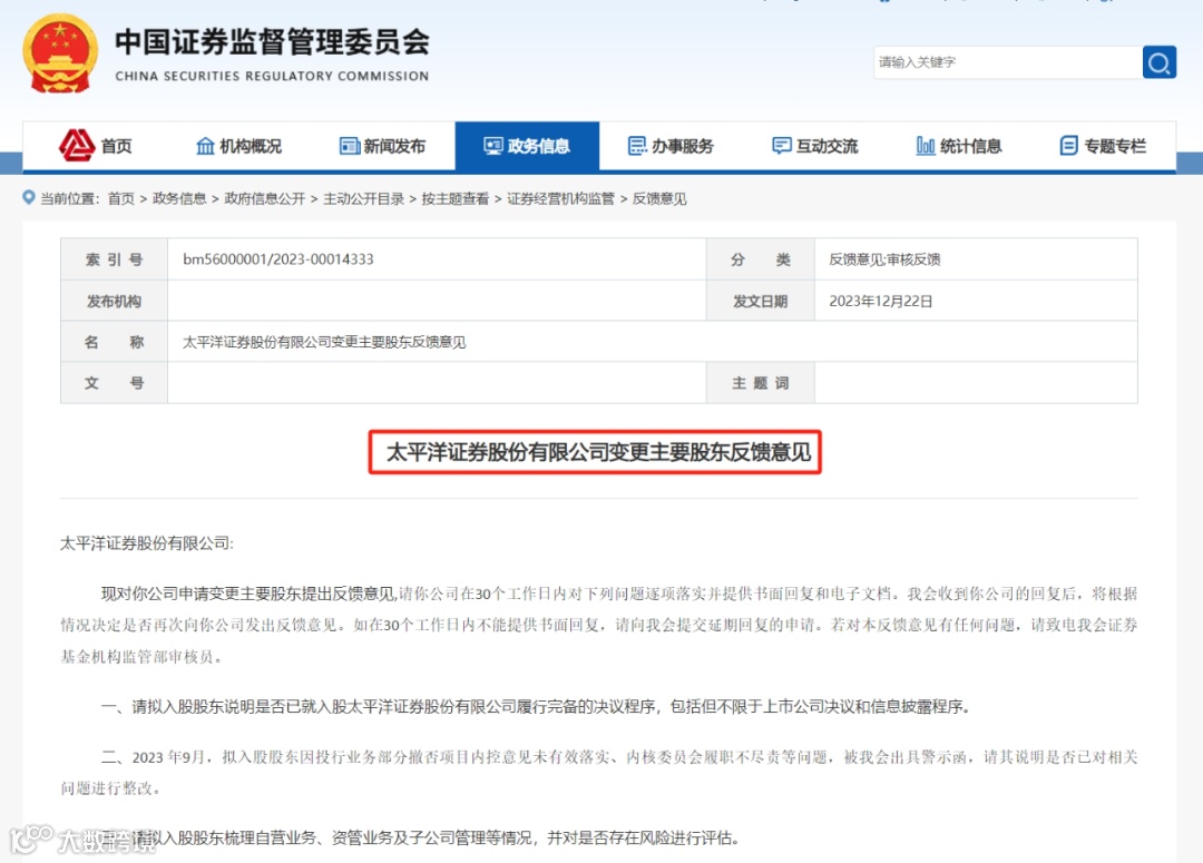 2023年12月22日晚,证监会披露对太平洋证券变更主要股东的反馈意见。华创证券终于距离入主太平洋仅差临门一脚。