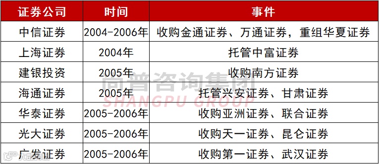 如2004-2006年,中信证券收购万通证券、金通证券,重组华夏证券;2005-2006年,华泰证券收购亚洲证券、联合证券;广发证券收购第一证券、