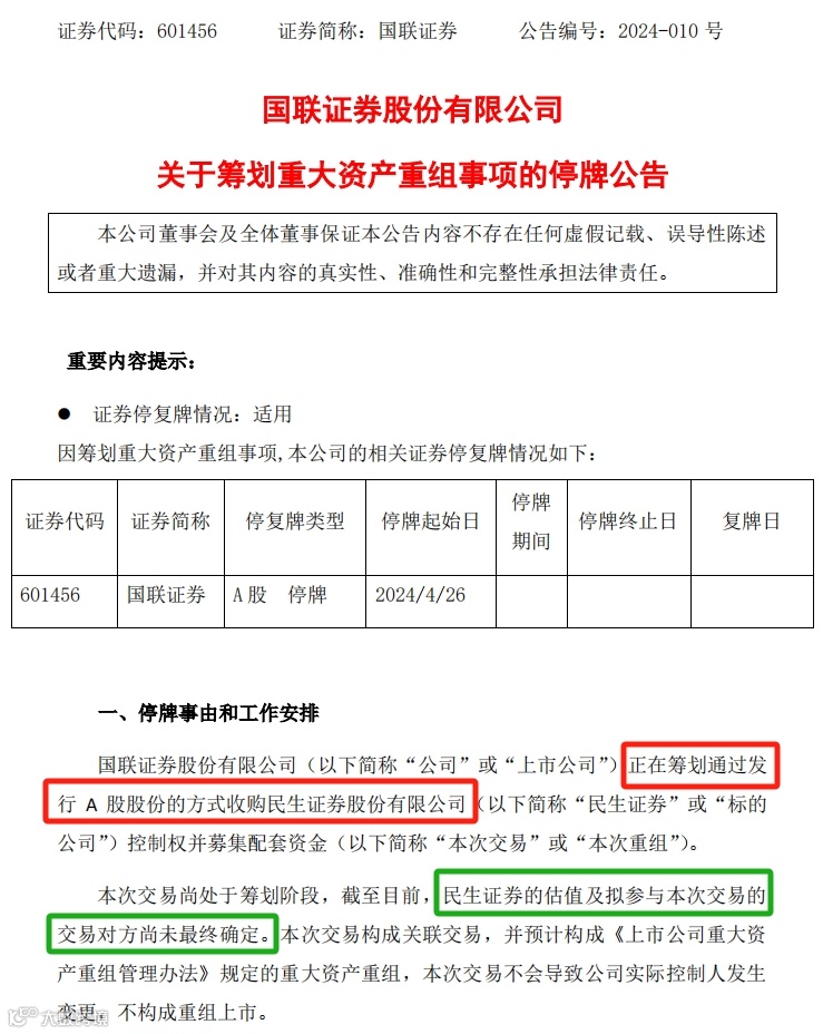 2024年4月25日,国联证券发布关于筹划重大资产重组事项的停牌公告称,