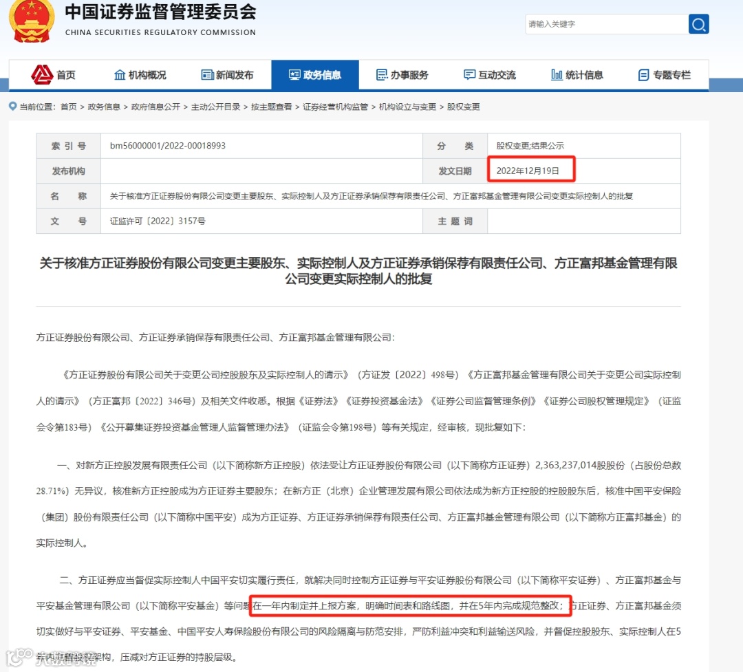 2022年12月19日,证监会核准了方正证券等公司变更主要股东、实际控制人的批复。