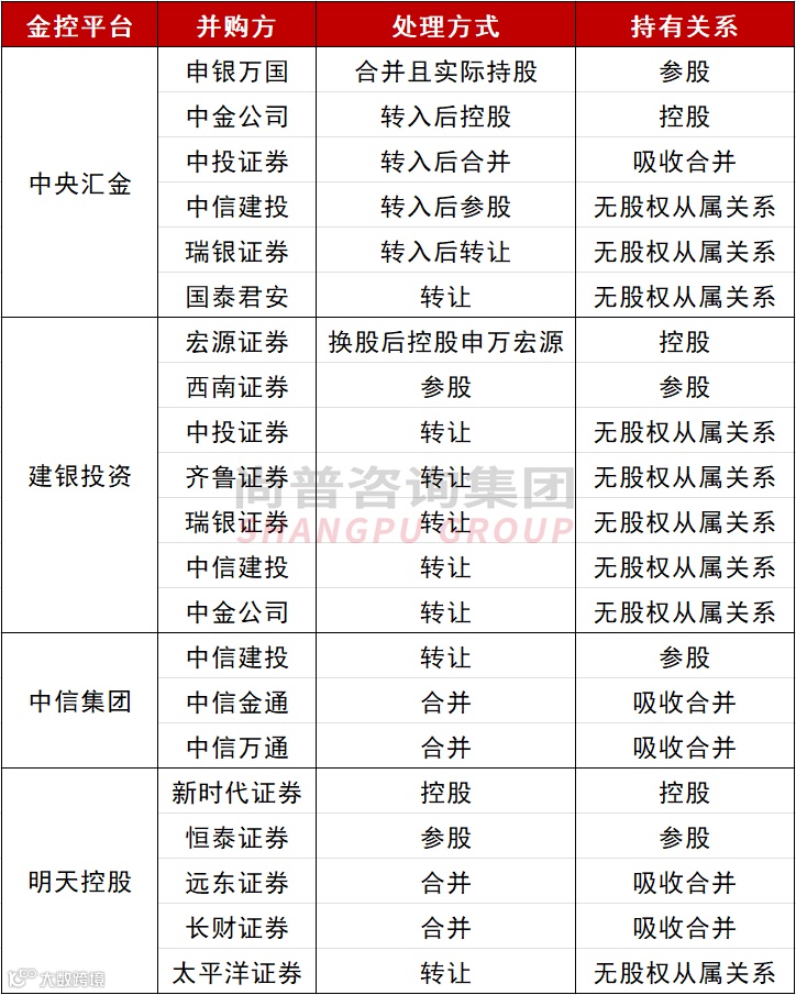 这一要求具体是指“一家机构或者受同一实际控制人控制的多家机构参股证券公司的数量不得超过两家,其中控股证券公司的数量不得超过一家”。政策发布之后“汇金系”、“建银系”、“中信系”以及“明天系”等金控平台开始了规模庞大的整合。