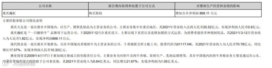 根据新乳业2021年年报披露,重庆瀚虹为其带来营业收入1.82亿元,净利润868.11万元。当年,新乳业整体净利润约3.12亿元。也就是说,重庆瀚虹当年为新乳业带来的净利润占比约2.78%。