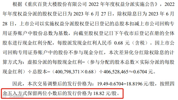 关于发行价格的计算方法,重庆百货在上会稿中表示,基于上市公司停牌前的市场走势等因素,充分考虑各方利益,交易各方确定本次吸收合并的发行价格为定价基准日前 60 个交易日上市公司股票交易均价的90%,即19.49元/股。同时考虑现金分红等因素,因此本次交易调整后的发行价格为18.82元/股。