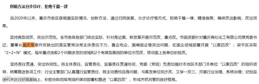 暂未找到。不过,中纪委2021年6月发布的文章提及,重庆市国资委针对商社化工原党委书记、董事长庞庆军案件反映出的落实管党治党主体责任不力,靠企吃企、围啃国企等突出问题,在国企领域部署开展“以案四改”。