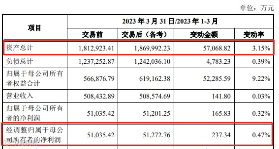 从财务数据来看,根据天健审计出具的《备考审阅报告》,重庆百货交易前截至2023年3月31日的总资产为181.29亿元,交易后该数额变为187亿元,变动率为3.15%;2023年第一季度经调整归母净利润,交易前为5.1亿元,交易后为5.13亿元,变动率为0.47%。