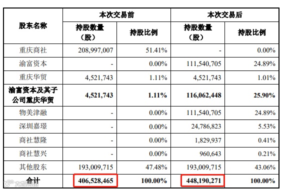 初步计算,比如渝富资本及其子公司重庆华贸的持股比例将提升1.91个百分点,即由23.99%升至25.9%。