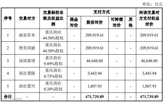 此次重大资产重组,重庆百货便是想用发行股份的方式,将重庆商社吸收合并。重庆商社持有的重庆百货股份将被注销,重庆商社的股东渝富资本、物美津融、深圳嘉璟、商社慧隆、商社慧兴等将成为重庆百货的股东。
