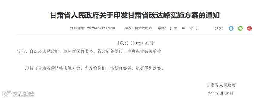 5月,甘肃省人民政府发布《关于甘肃省碳达峰实施方案的通知》。《通知》指出,到2030年,力争全省新能源装机容量突破1.3亿千瓦。大力发展新能源。全面推进风电、太阳能发电大规模开发和高质量发展。持续推进酒泉千万千瓦级风电基地向特大型风光电基地迈进,打造金(昌)张(掖)武(威)千万千瓦级风光电基地。