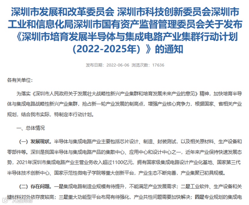 去年6月,深圳发布《深圳市培育发展半导体与集成电路产业集群行动计划(2022-2025年)》,指出到2025年,建成具有影响力的半导体与集成电路产业集群,产业规模大幅增长,制造、封测等关键环节达到国内领先水平。