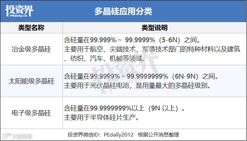 其中,多晶硅作为以工业硅为原料提纯后达到一定纯度的硅材料,起到了优秀的中间品作用。多晶硅根据纯度的不同可分为冶金级、太阳能级以及电子级。