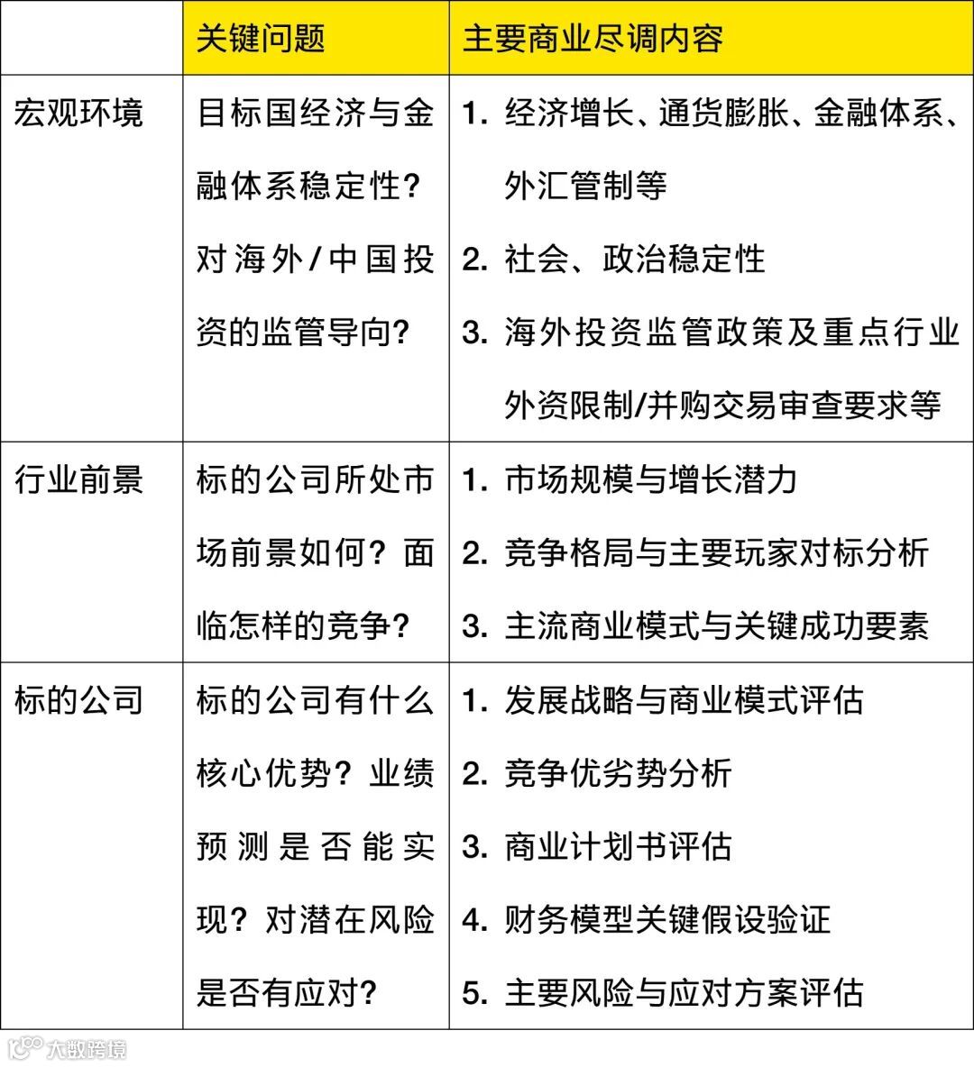 通常一项海外并购的全面商业尽职调查内容包括宏观环境分析、行业前景分析与标的公司评估三大方面: