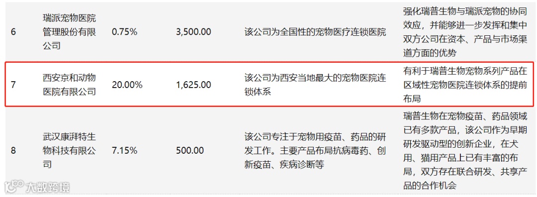 不过值得注意的是,2021年2月,创业板公司瑞普生物(300119)旗下的产业基金瑞济创投基金首进京和动物医院,投资1625万元持股20%,按此计,当时京和动物医院估值已超8000万元,具体算下来为8125万元。