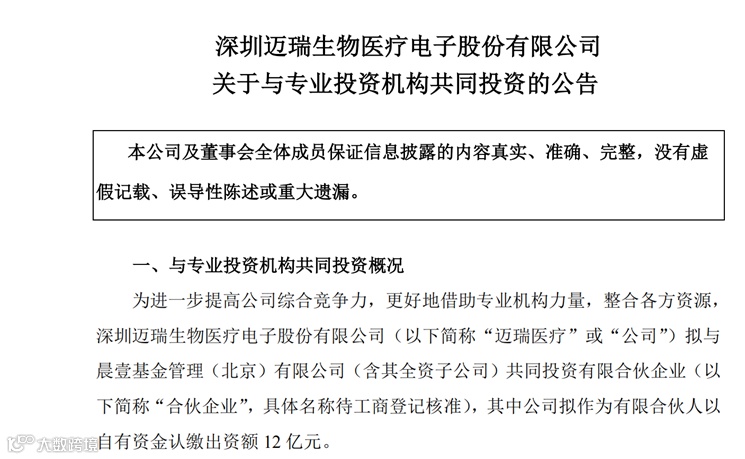 近日,迈瑞医疗公告,拟与晨壹基金管理(