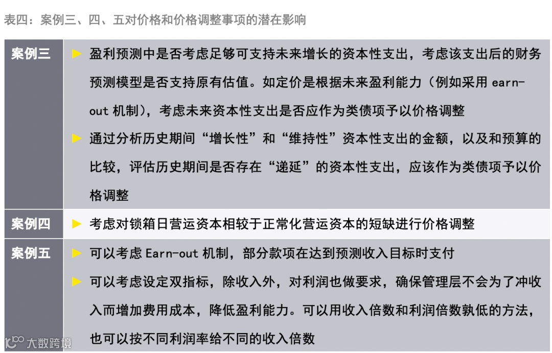 有条件支付 (“Earn-out”) 机制:交易对价的部分金额在交割时支付,还有部分金额需要目标公司在交割后特定时间内达到某些特定目标才能支付。触发支付的目标通常会根据尽调时目标公司的财务预测模型或商业计划书来确定,多数是财务指标,也可以是业务指标或里程碑事件。Earn-out不仅仅是价格调整机制,同时可以起到对留任管理层卖方的激励作用。此外,如买方因尽调限制而对历史数据有顾虑(案例二),也可以考虑Earn-out机制(这类情况下评估期距交割的时间可以较短,触发支付的目标可参考历史水平)。