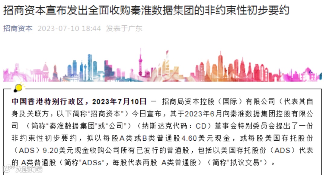 7月10日,招商局资本控股(国际)有限公司(下称“招商资本”)宣布,其向秦淮数据(纳斯达克代码:CD)董事会特别委员会提出了一份非约束性初步要约。