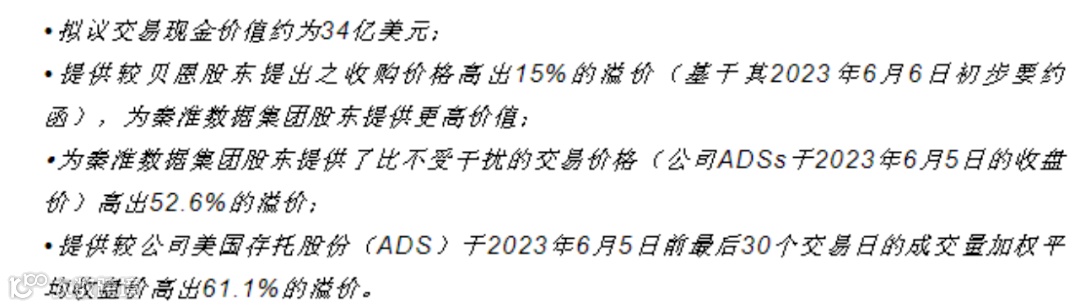 同时,招商资本表示,该价格为秦淮数据股东提供了比不受干扰的交易价格(公司ADSs于2023年6月5日的收盘价)高出52.6%的溢价;提供较公司美国存托股份(ADS)于2023年6月5日前最后30个交易日的成交量加权平均收盘价高出61.1%的溢价。
