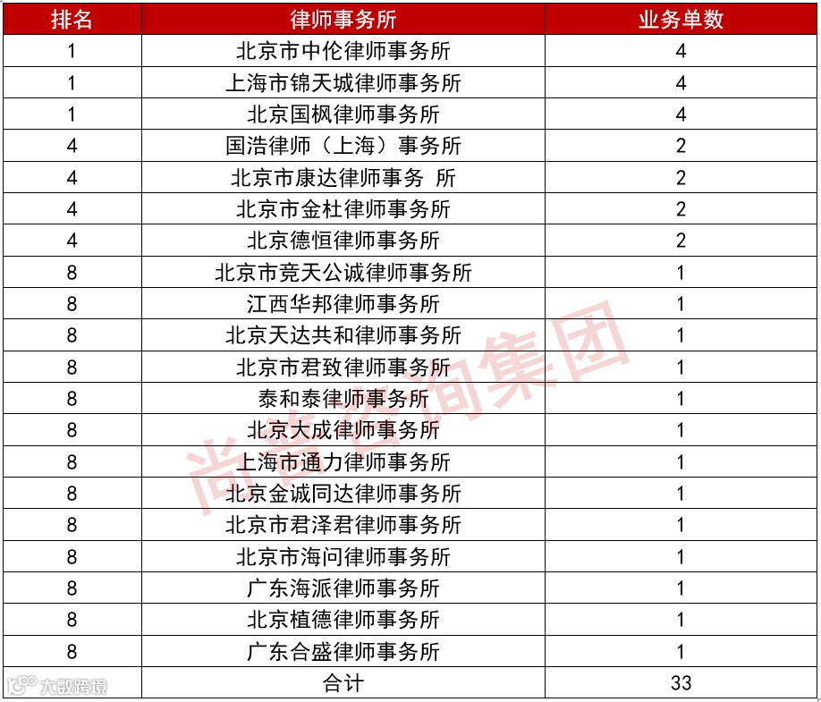 中伦、锦天城、国枫并列第一,业务单数均为4单。