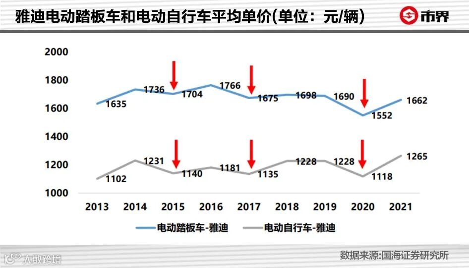 2017年,雅迪电动踏板车的平均单价由前一年的1766元降到1675元,电动自行车平均单价由1181元降到1135元,同时后者的营收占比从前一年的22.9%提升至25.5%。