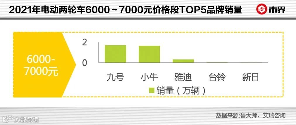 据《鲁大师2021年电动两轮车行业调研报告》,在6000~7000元高端价格带中,九号、小牛的销量分别为第一、第二,雅迪则是第三名,且销量与九号、小牛差距较大。