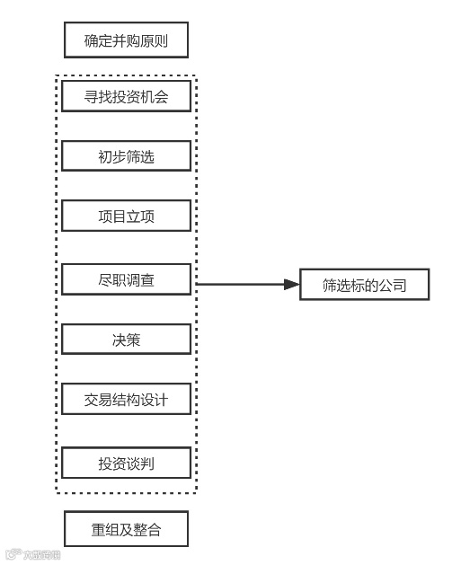 尽职调查在投资收购项目立项后实施,是并购实施阶段中的第一步。如下图所示,