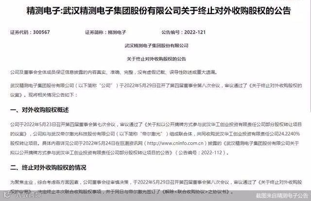 5月23日晚间才官宣的股权收购事项,如今精测电子(300567)、帝尔激光(300776)两公司双双宣布终止。5月29日晚间,精测电子、帝尔激光先后披露了终止对外收购股权公告,两公司原拟组成联合体,共同收购武汉华工创业投资有限责任公司(以下简称“华工创投”)24.224%股权转让项目。对于终止联合收购华工创投的原因,两公司均表示,为聚焦主业。