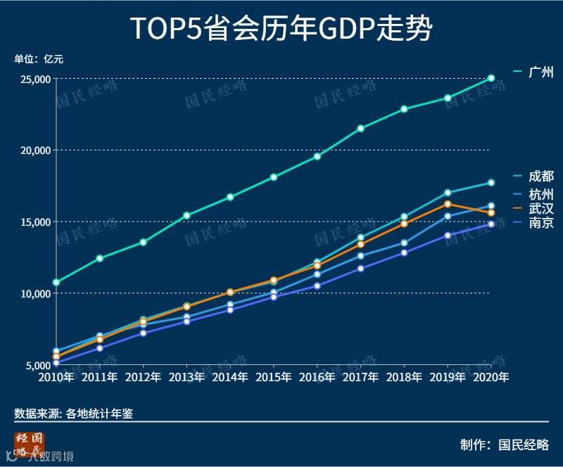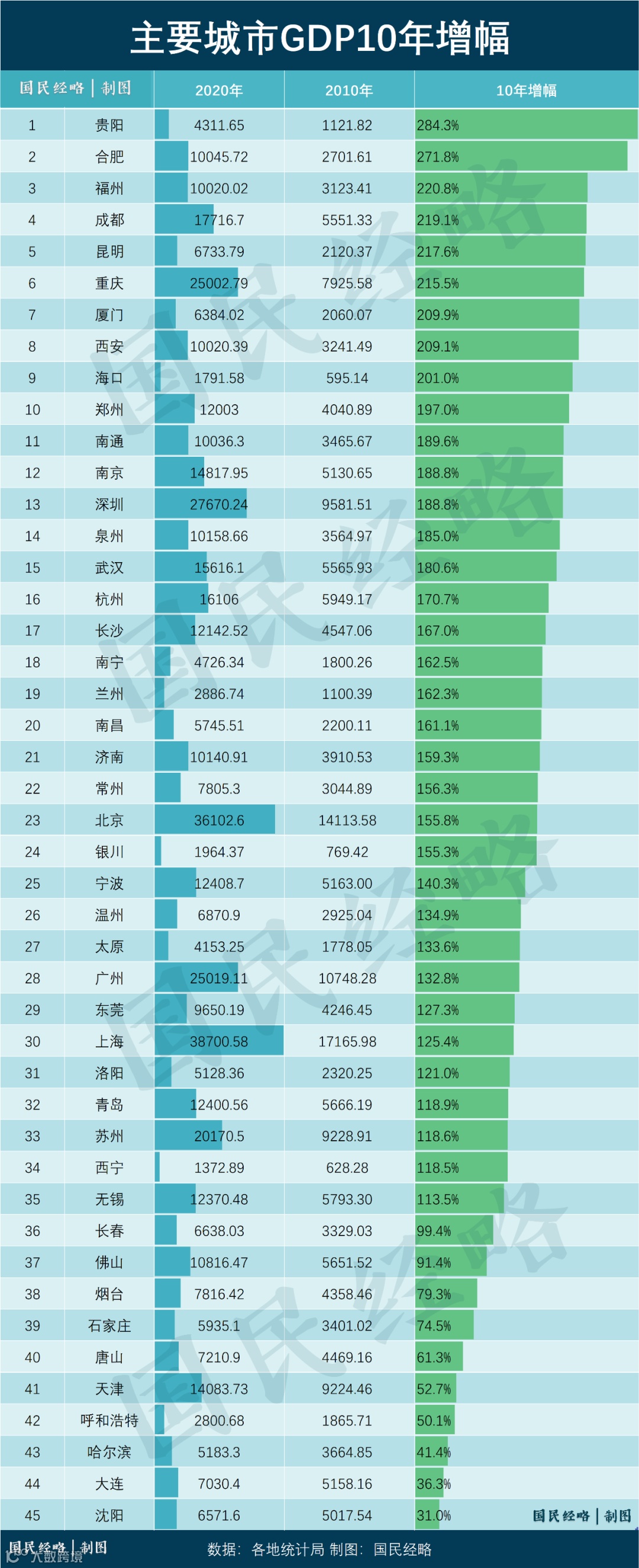 过去10年,GDP增长最快的5个城市:贵阳、合肥、福州、成都、昆明。