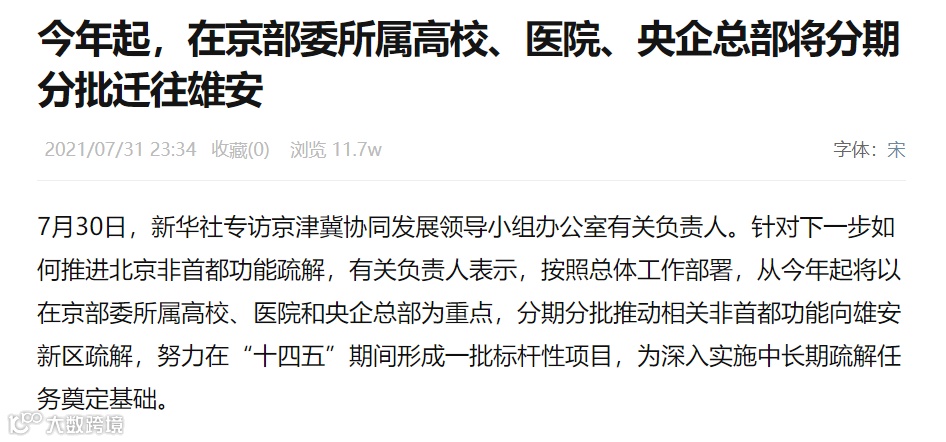 而在前不久的国新办发布会上,有关负责人明确表示,从2021年起,部分在京部委所属高校、医院和央企总部已启动分期分批向新区疏解。