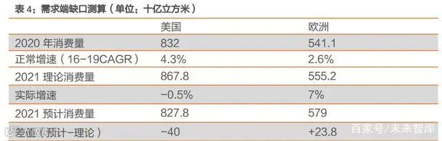 我们使用两种方法对 2021 年全球天然气供需缺口进行预测。方法一聚焦全球前两大天然气消费和供给地区,以 2016 年-2019 年(排除 2020 年疫情影 响)的实际复合增速为基础,结合 2021 年 1-8 月实际增速,预估 2021 年预计值与理论值(按照历史复合增速增长)的差异。