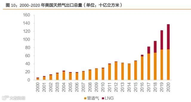 出口总量方面,2016 年 2 萨宾帕斯项目成功出口美国本土的第一船 LNG 资源,美国天 然气出口随之进入快速上升期。2020 虽然受到疫情影响,天然气出口量仍然达到 1375 亿立方米并创下历史新高,相较于 2019 年增长 11.9%。