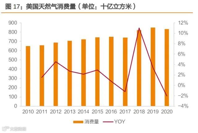 美国不仅是全球天然气第一大生产国,同样也是全球第一大天然气消费国。2020 年天然气 在美国能源消费结构中占比高达 34%,与第一大能源石油的占比相当。消费总量方面,近 十年来美国天然气消费保持稳步上升趋势,2010-2020 年年均复合增速为 2.5%。2020 年天 然气消费量为 8320 亿立方米,较 2019 年同比下滑 2%。
